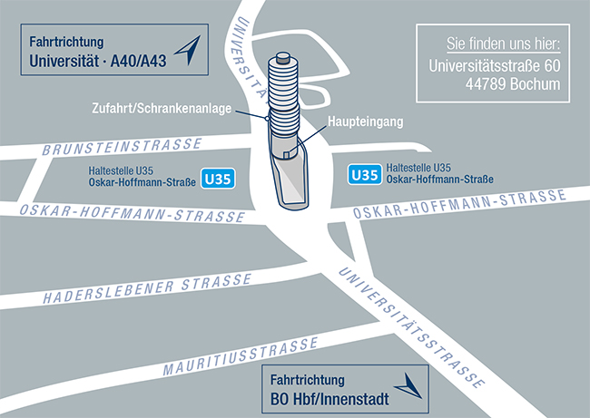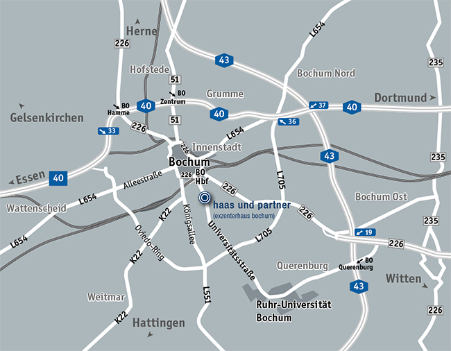 Besuchen Sie uns im exzenterhaus bochum – mit einer Gesamthöhe von 89.00 Metern ein markantes Wahrzeichen unserer Stadt! Unsere Büros in der 22. und 23. Etage garantieren beste Aussichten.